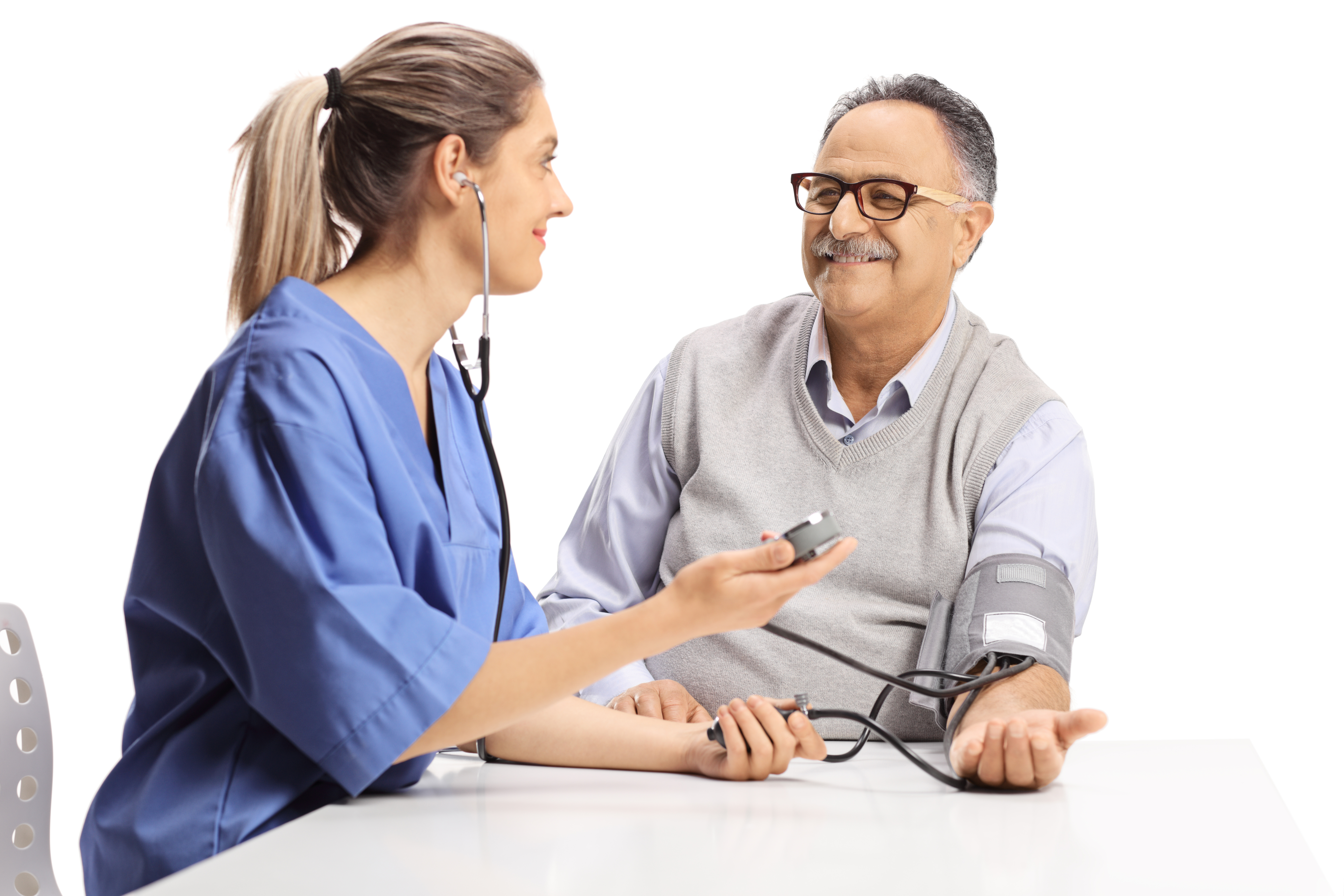 Young female urse checking blood pressure to an elderly man