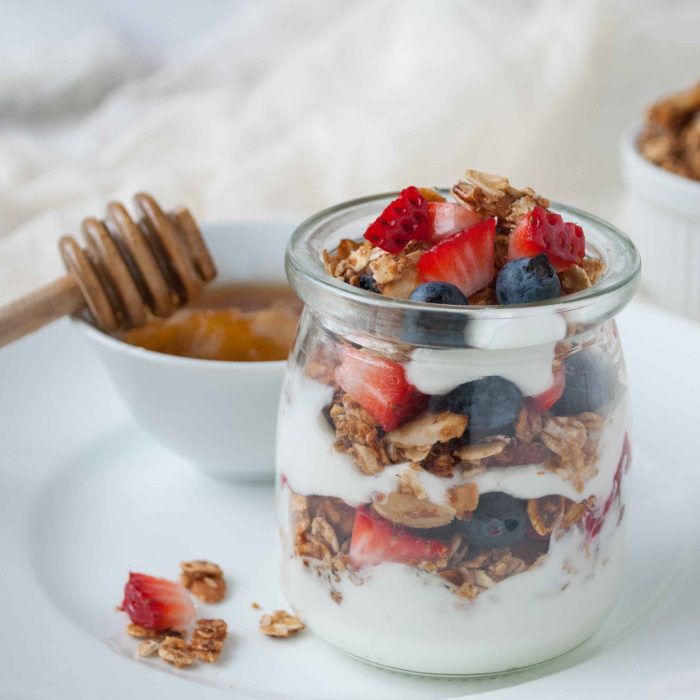 Get a boost of calcium from this fruit and yogurt parfait. Honey yogurt parfaits are a delicious way to add healthy oats, almonds, yogurt and fresh berries to your day.