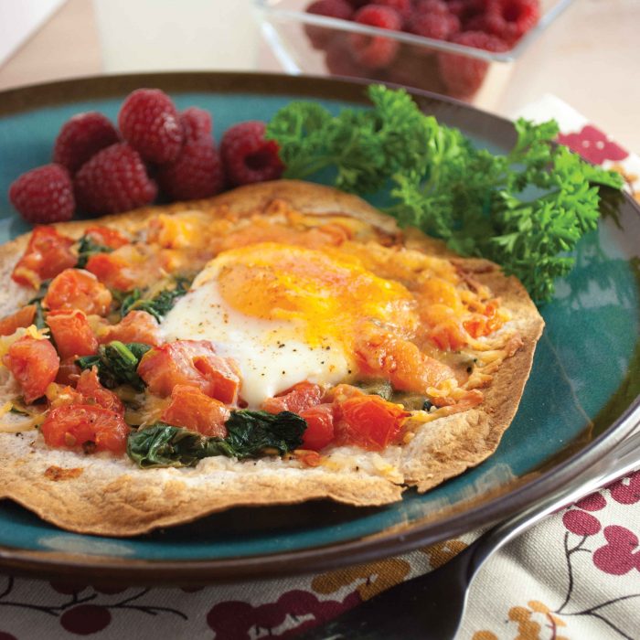 Try this breakfast tortilla for a healthy open-faced breakfast sandwich. This easy egg recipe makes a delicious high protein breakfast or light lunch.