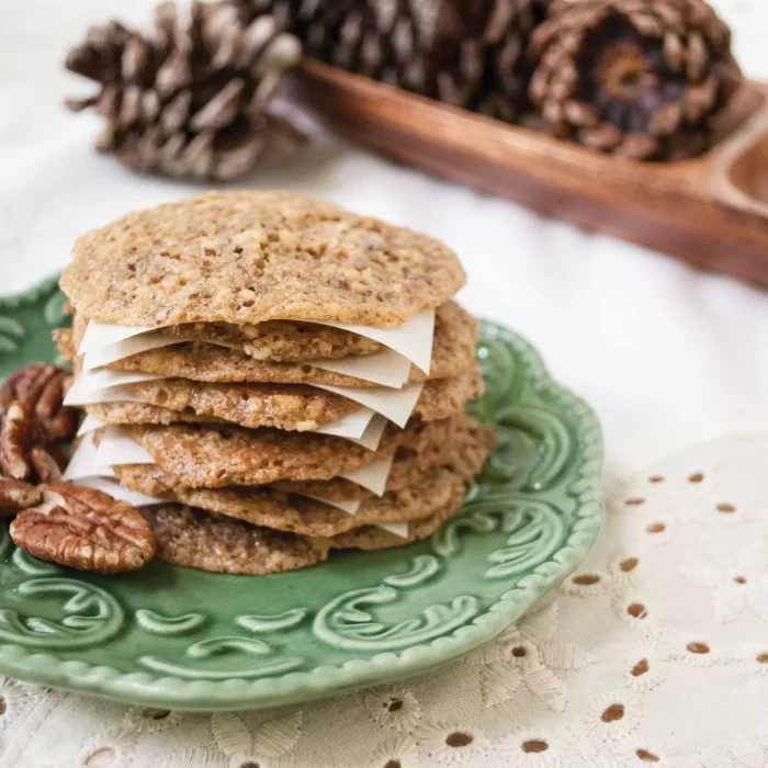 Delicate and light, these yummy pecan lace cookies are a sweet treat that are under 50 calories a serving.