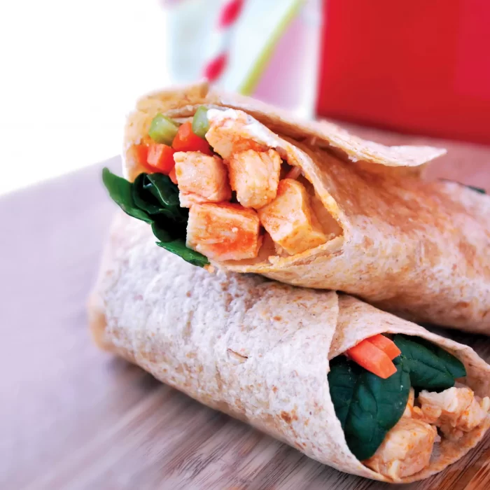 Try a chicken sandwich with a little bit of kick. This Buffalo chicken wrap gives you all the great flavors of Buffalo wings without the fat. There’s even blue cheese, celery and carrots.