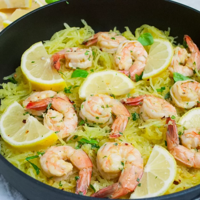 Spaghetti squash is the original gluten-free “pasta,” plus it’s low-calorie and low-carb. Topping it with tasty lemon garlic shrimp gives this satisfying entrée a good dose of protein, too.