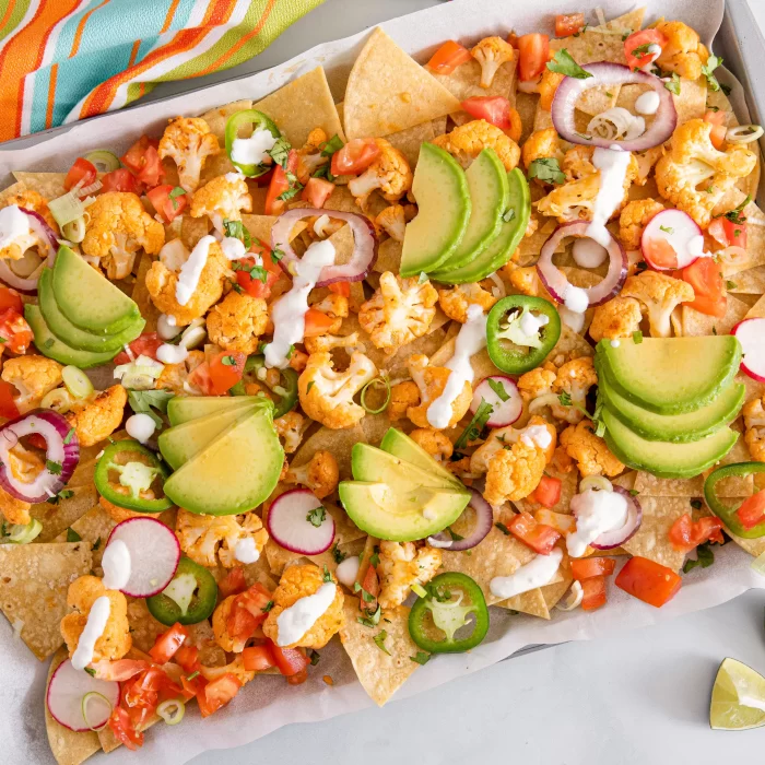 Nachos don’t have to be dripping with cheese and sour cream to be delicious. These vegetarian nachos are made with buffalo roasted cauliflower and creamy cashew sauce for a kick of flavor without a lot of fat. Healthy toppings make this vegan appetizer a great alternative to fast food nachos.