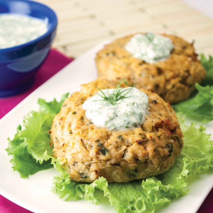 These tasty salmon cakes get an extra punch of protein and calcium from delicious cannellini beans. Yogurt is a healthy substitute for tartar sauce in creamy, rich dill sauce topping.