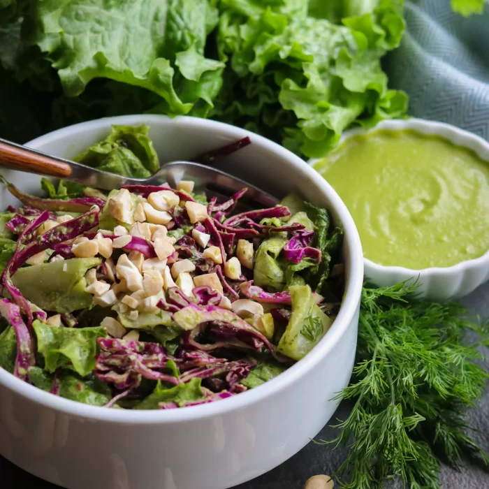 Crisp romaine lettuce and vibrant red cabbage are dressed in our flavorful Green Goddess Dressing for delicious nutrient-rich salad. This beautifully fresh and verdant recipe is perfect for a quick and easy weekday lunch or a healthy accompaniment to a main course.