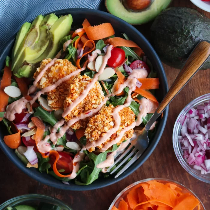 Our amazing gluten-free bang bang shrimp and bang bang dressing recipes are tossed with dark leafy greens and fresh vegetables for a healthy flavor-packed salad. This recipe is so delicious you will be opting to make this salad at home rather than going out to dinner!