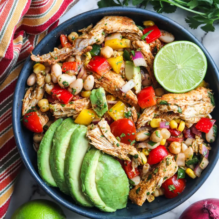 Mexican Chicken Salad is a delicious mix of boldly-seasoned, baked chicken, fresh veggies, and beans tossed in a lime dressing. It’s full of protein and flavor, with a little spice from jalapeño. You can eat it by itself or on top of lettuce for a light and tasty meal everyone will love!