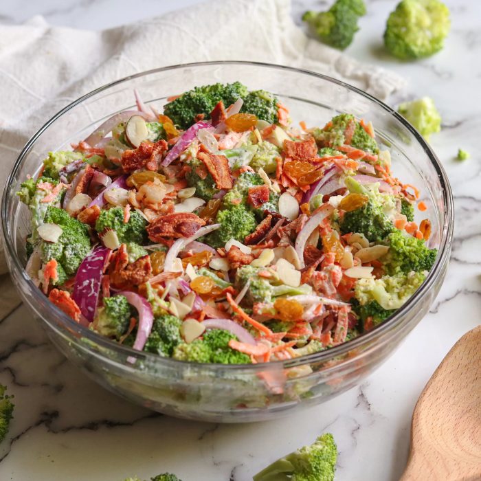 This healthy broccoli salad is packed with crunch from toasted almonds and shredded carrots, and a tasty natural sweetness from raisins. Crispy bacon adds smoky flavor, and it’s all mixed in a creamy, tangy yogurt dressing. It’s easy to make in 35 minutes and it’s a perfect side dish for lunch, dinner, or a party.
