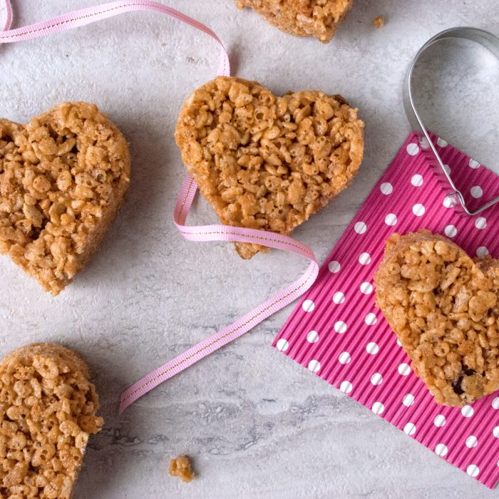 These healthy crispy rice cereal treats are made with creamy peanut butter. Turn them into a healthy Valentine snack by cutting out heart-shaped treats. No one will miss the marshmallows!