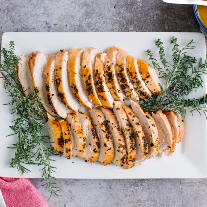 If you don’t want to battle with an entire turkey, making a turkey breast is an easy alternative. Plus, a turkey breast is all white meat, a healthier option than higher-fat dark meat. A 6-lb bone-in breast will serve 8 people.