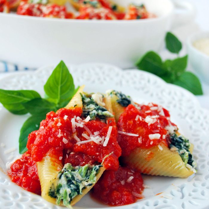 If you are looking for a vegetarian entree this holiday season, it doesn’t get better than this. Stuffed with creamy mozzarella and ricotta cheese and spinach, your guests will never know that these Spinach Stuffed Shells are low fat.