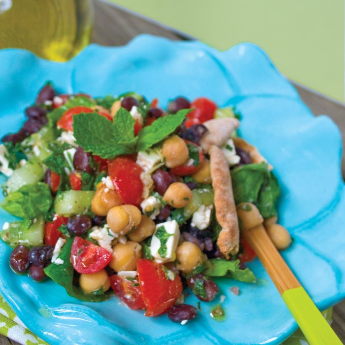 This healthy salad is packed with flavor and great nutrition. High-protein beans, fresh tomatoes and herbs, and healthy olive oil make this Mediterranean bean salad a tasty lunch.