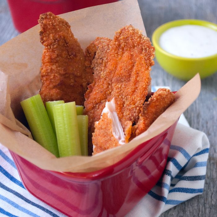 Get Buffalo wings flavor without Buffalo wings fat. Try these spicy chicken tenders marinated in buttermilk and hot sauce for a tasty, low-fat crowd pleaser.