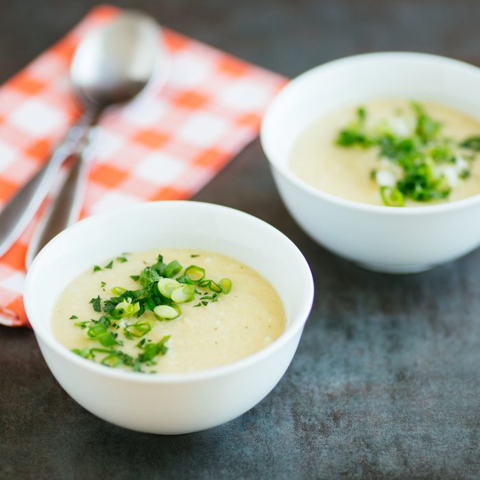 The mellow flavors of leeks and cauliflower make this a satisfying soup for lunch or a light dinner. Just a touch of coconut milk gives the soup a creamy texture without a lot of fat.