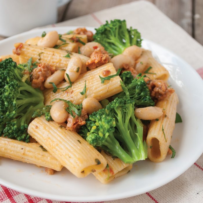 Rigatoni is a perfect match for this hearty turkey sausage and white bean pasta sauce. Any pasta with ridges to hold more sauce will work well. You will want every bit of this robust sauce.