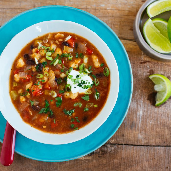 This hearty vegetarian chili is made with hominy, a staple in Mexican cuisine. Hominy is dried corn that is used in Mexico to make tortillas. In the U.S., it is often used to make grits. You can find canned hominy in your local supermarket.