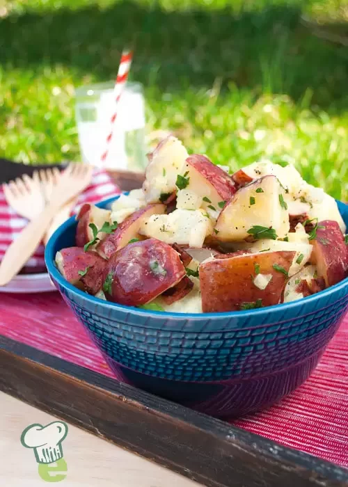 Potato salad doesn’t have to be smothered in fattening mayonnaise to taste good. Apple cider vinegar and sweet onion give this potato salad flavor without adding fat or extra calories. Serve it warm.