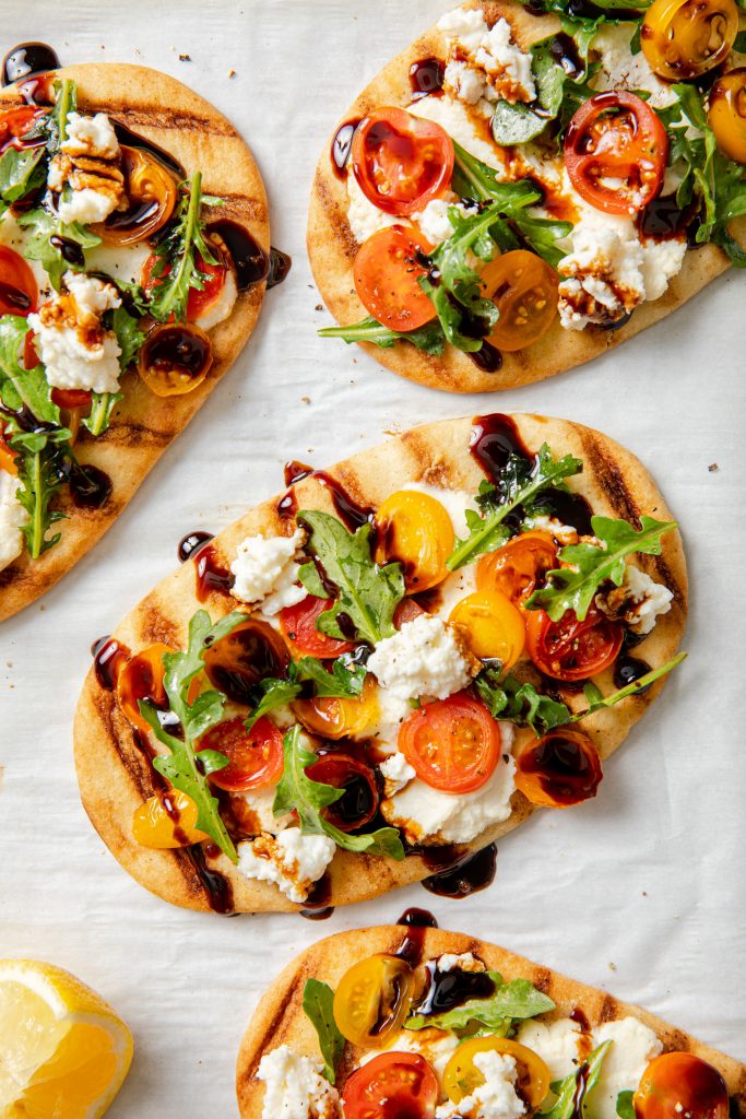 2. Arrange flatbreads on 2 baking sheets. Cover each flatbread with a layer of the ricotta cheese and the tomatoes. Bake for about 10 minutes, or until the cheese is melted.