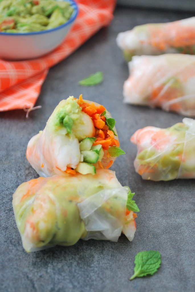 1. Fill a large pot or bowl with hot water. Dip 1 sheet of rice paper into hot water for 5 to 10 seconds, or until hydrated. Lay out rice paper on a plate. In the center of the rice paper, arrange some of the shrimp, carrot, cucumber, guacamole and mint. Roll the rice paper by folding 2 sides in and then rolling from the bottom up. The rice paper is sticky and will seal the roll up. Repeat with remaining ingredients. The shrimp rolls can be made 1 day ahead and kept wrapped in plastic wrap and refrigerated.