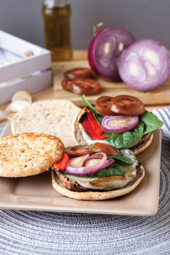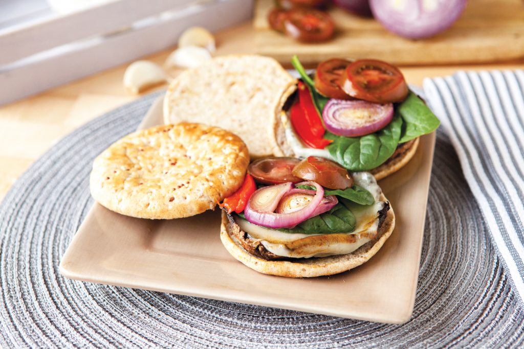 4. With a spatula, transfer each mushroom cap to the bottom half of a roll. Top each mushroom with red onion, roasted pepper, spinach and tomato, if using.
