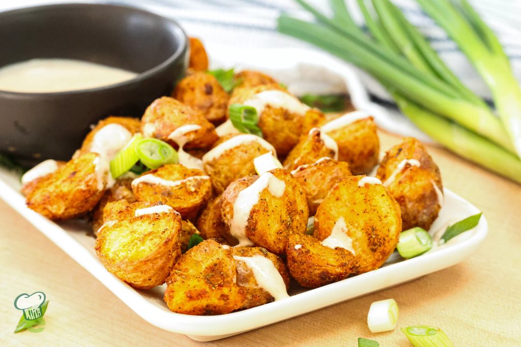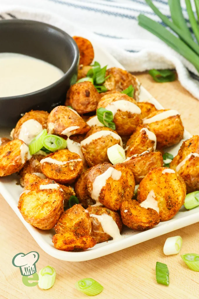 6. When the potatoes are done cooking, transfer to a serving dish, drizzle with Bang Bang Sauce and garnish with sliced green onion.