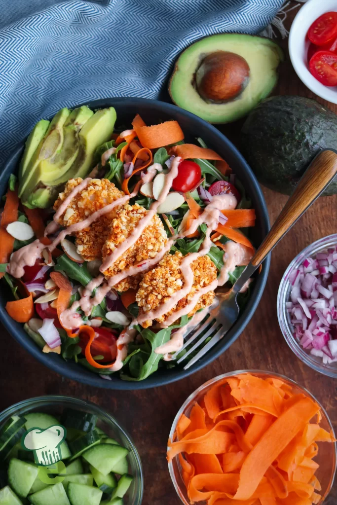 Our amazing gluten-free bang bang shrimp and bang bang dressing recipes are tossed with dark leafy greens and fresh vegetables for a healthy flavor-packed salad. This recipe is so delicious you will be opting to make this salad at home rather than going out to dinner!
