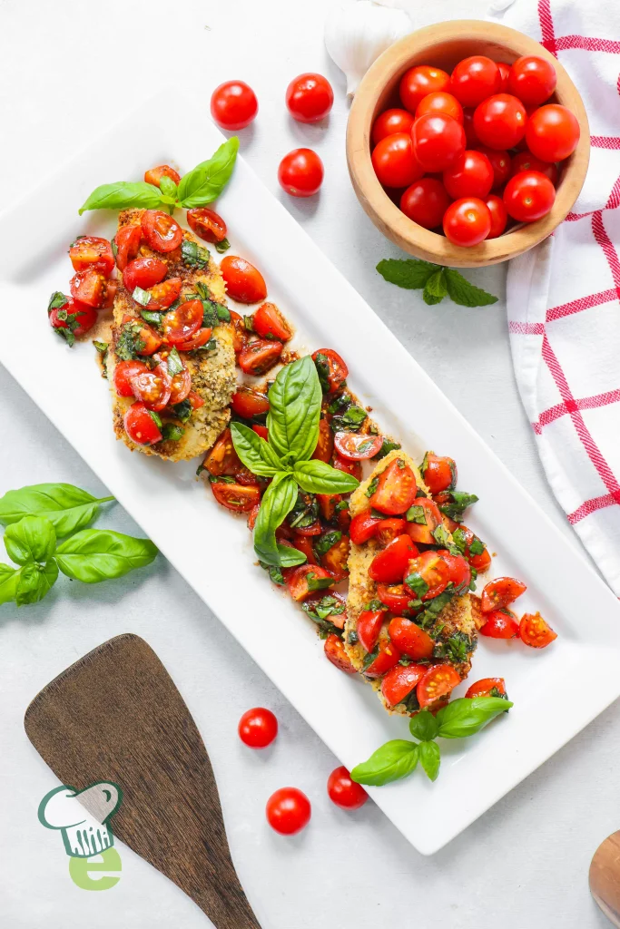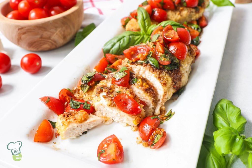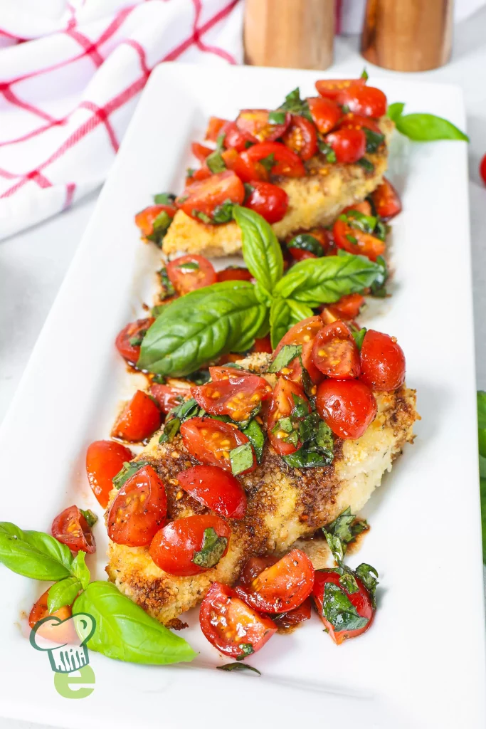 This Bruschetta Chicken is crispy, tasty, and easy to make. While the chicken bakes in the oven, juicy tomatoes, garlic, and fresh herbs are tossed together with tangy balsamic vinegar. Serve it on top for a colorful and fun dinner. Great for a date night or lunch you can pack ahead.