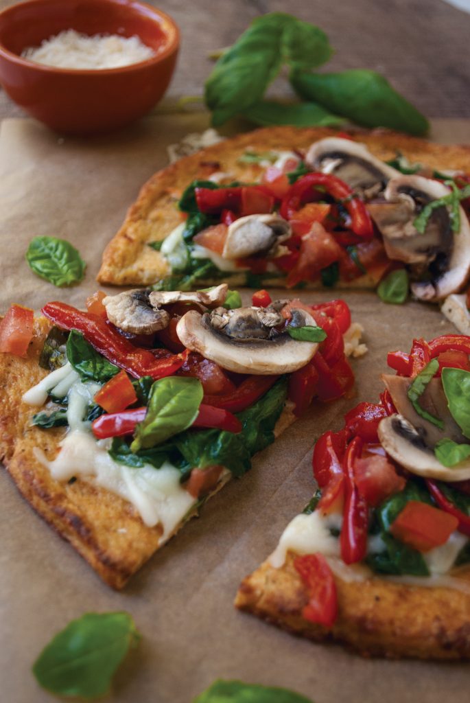 Here’s a gluten free pizza that substitutes the bread crust with healthy cauliflower. Topped with vegetables and cheese, this nutrient-packed pizza is high fiber, too.