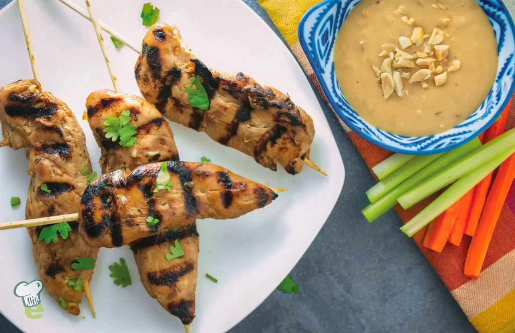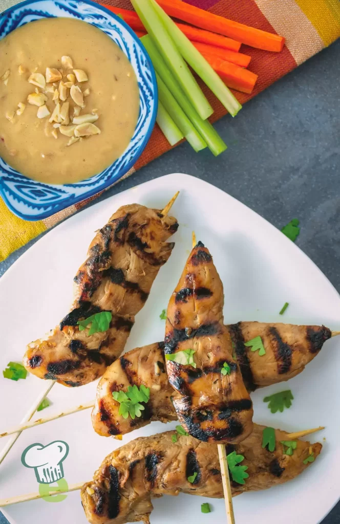 3. Preheat grill to medium high. Thread the chicken on 16 skewers. Grill the chicken for 3 minutes on each side, or until cooked through. Serve with the dipping sauce, carrots and celery.