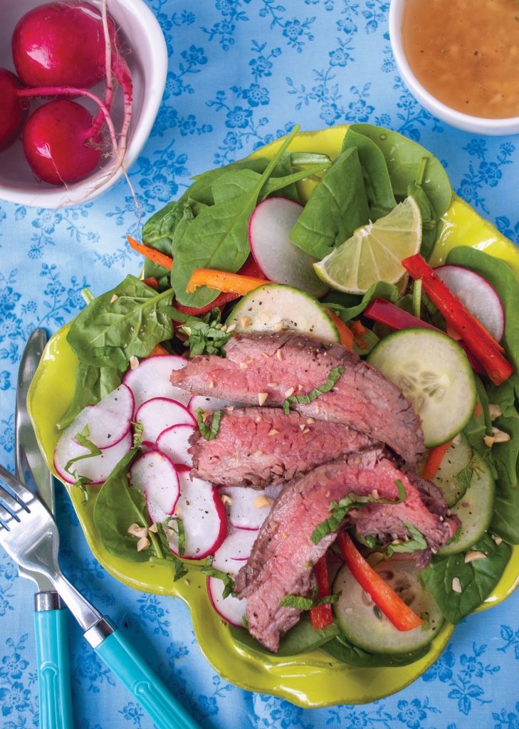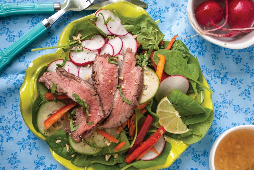 Loaded with the bright flavors of spring produce, this easy steak salad is bursting with color and healthy nutrients. Let the steak soak up the flavors of a lively garlic ginger marinade while you prep the veggies and fresh spring herbs.