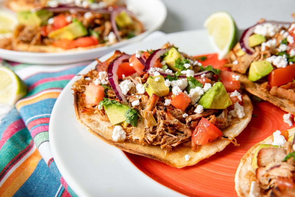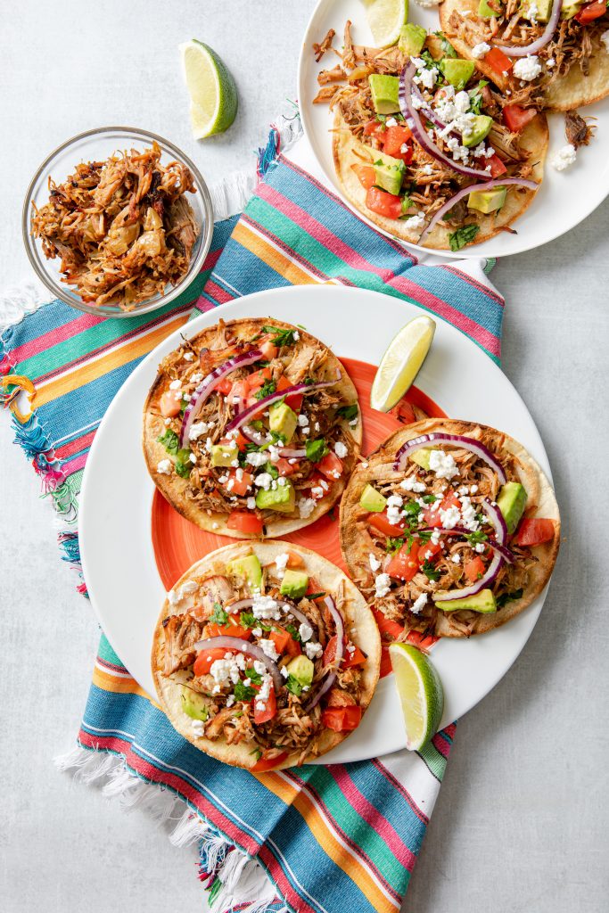 2. Assemble the tostadas: top each tortilla with pork and desired toppings. Serve with lime wedges.