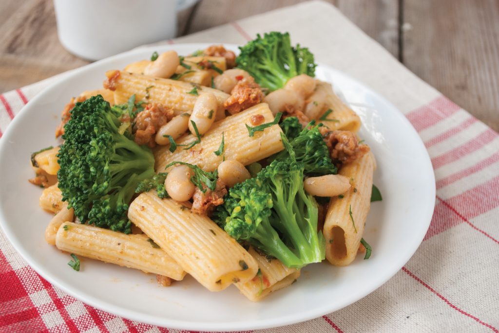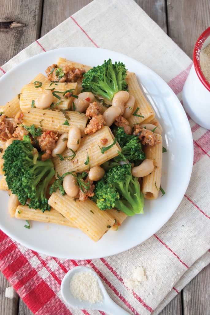 Rigatoni is a perfect match for this hearty turkey sausage and white bean pasta sauce. Any pasta with ridges to hold more sauce will work well. You will want every bit of this robust sauce.