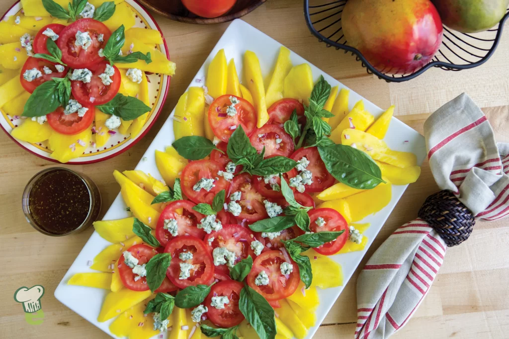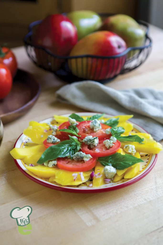 2. Prepare the salad: On a large platter, arrange the tomato and mango slices. Stir the dressing and drizzle over the tomatoes and mangoes. Sprinkle the blue cheese on top and garnish with whole basil leaves.