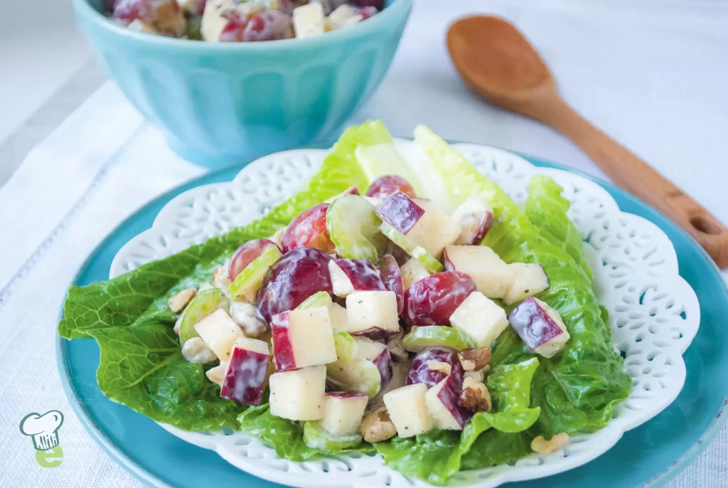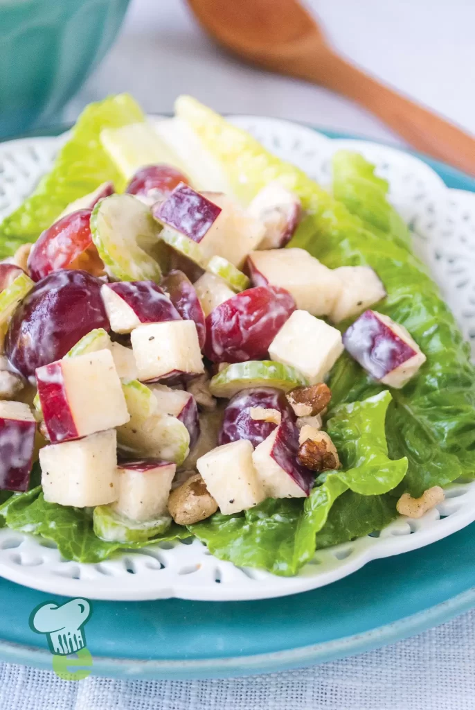 Lighten up a classic Waldorf salad by substituting fat free yogurt for high fat mayonnaise. This salad is super light and easy to make. With about 100 calories a serving, you can have seconds.